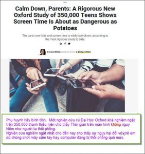 HCD: Tóm tắt nguyên bài báo: Không có gì ngạc nhiên khi nhiều phụ huynh ngày nay vô cùng lo lắng về thời gian dùng màn hình của trẻ con. (Trước đây) Một loạt các nghiên cứu, nhiều nghiên cứu do giáo sư tâm lý học của Đại học bang San Diego Jean Twenge dẫn đầu đã tuyên bố rằng việc nhìn chằm chằm vào màn hình đã dẫn đến mức độ đáng lo ngại, gây trầm cảm và “đau khổ” nói chung (general misery) ở những người trẻ tuổi. Nó có vẻ là sai.