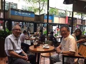 Sáng sớm Hai Trầu phone gọi mình cafe, đi đâu cũng được và mình đề nghị ra Đường Sách, chắc chắn ở đó Hai trầu sẽ được đắm chìm với sách. Anh nói anh về vội, thậm chí chưa cho Phạm Văn Nhàn – người bạn thân thiết gần gũi – biết, dù hôm qua mới gặp nhau. Rồi anh kêu chụp cái hình “hai đứa mình” gởi PVN coi cho giựt mình chơi! Nhàn kêu trời, “cái ông Huyện này trốn đi chơi, chẳng cho ai hay cả!”. Cái ‘xóm’ của Hai Trầu có nhưng người hàng xóm mà anh rất quý mến: Phạm Văn Nhàn, Tô Thẩm Huy, Cái Trọng Ty, và cả nhà thơ Tô Thùy Yên…