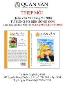 Quán Văn Số 58 ra mắt 9h sáng ngày 23.9.2018 tại Cafe Lọ Lem 345 Nguyễn Trọng Tuyển như thường lệ nhưng lần này đặc biệt giới thiệu Chân dung văn học của Elena Pucillo Trương, cô dâu Ý xứ Bình Định của Trương Văn Dân.