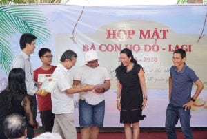 Anh Đỗ Hồng Thái (cà-vạt) con Bác Năm là “chủ xị” kỳ này. Trong dòng tôc, cứ mỗi năm luân phiên chủ xị. Cũng vui. Có làm học bổng cho các cháu học giỏi, ngoan. Thế hệ F1, ông già mình gồm Cô Hai (mẹ chị Oanh, Yến…); bác Ba Đỗ Đơn Thơ (giỏi văn thơ), bác Tư Đỗ Đơn Bút (giỏi võ) bác Năm Đỗ Đơn Thanh (giỏi thơ Đường, cờ tướng), Ba mình, ông Bảy Đỗ Đơn Trì (chơi violon, đóng kịch), chú Chín Đỗ Đơn Đình (vô địch cờ tướng), chú Mười Đỗ Đơn Chiếu (nhà báo Châu Anh, TKTS báo Đất Tổ Saigon)… Tóm lại, thế hệ F1 mỗi người một vẻ. Mình F2… rồi bây giờ đã thấy có F5, F6 chẳng nhớ nổi. May còn cái gia phả, chưa “bổ sung”… nhờ Đỗ Ái Liên (nhà thơ Đỗ Quyên F2) và các em cháu làm tiếp vậy.
