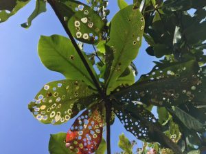 Có vẻ như mấy cây bàng dọc biển cũng chịu không nổi gió bấc. Chúng đành khoét lỗ chỗ trong lá cho gió xuyên qua… Khánh Minh bảo đó là lá bàng “rổ hoa”…