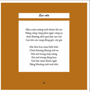 … nghe được hương trâm trâm bên vệ đường rầy xe lửa về quê nội, ai biết được mầu lấm tấm ngũ sắc kia đã cấy trong tôi mùi quyến luyến quê nhà đến vậy. Hễ chìm vào là nghe tiếng xe lửa xập xình, ánh nhìn cô gái nhỏ chạy lùi theo những hình ảnh vụt qua, bụi cây, ngọn núi, chiếc cầu nhỏ, những ô lúa xanh và con mương ốm chạy ngoằn ngoèo theo bờ ruộng…