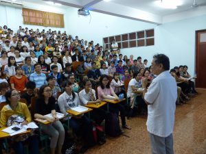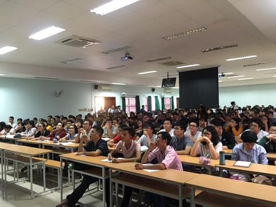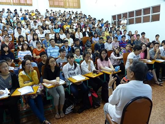 Đáng tiếc là lớp Y1 năm nay quá đông, cả ngàn em, nên chỉ có vài trăm em ở Giảng đường 508 là được tiếp xúc trực tiếp, còn các giảng đường khác, các em chỉ nghe tiếng và xem slides trên màn hình, thậm chí chẳng biết mặt thầy! Lớp quá đông thì khó mà có chất lượng đào tạo như mục tiêu đề ra được!
