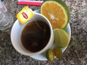 Trà lipton nóng, tự pha chế. tự vắt cam, chanh, quất vào tách trà, có sẵn táo tàu, xí muội, cam thảo… các thứ! Rất ngộ. Chỉ thấy có ở Phan Thiết.,