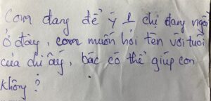 Con phải chỉ chị ấy là ai thì bác mới hỏi giùm con được. Bác sẽ nói với chị rằng có em nhỏ kia muốn biết tên và tuổi của chị nè!