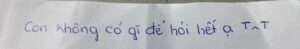 Tôi nghĩ làm cách nào cho giờ học được sinh động, tạo sự tham gia của các em ngay từ đầu, vì thế, tôi chon cách cho các em viết câu hỏi trên giấy, và tôi dùng Flipchart để viết vẽ…