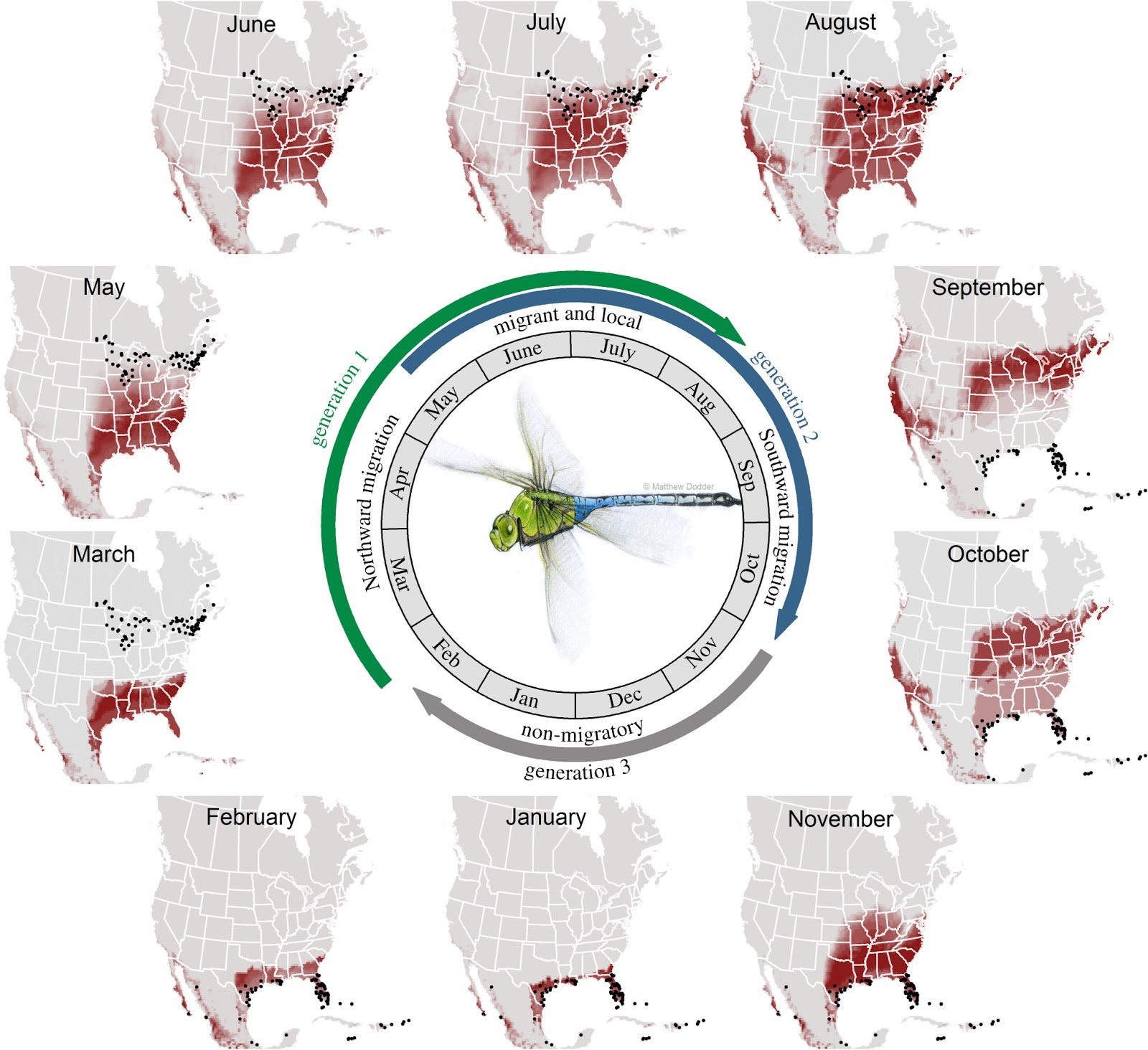 When those insects reach the south, they deposit another batch of eggs, which mature into a third generation that will live a non-migratory life over the winter on the coast, producing the eggs of the dragonflies that will migrate northward again in the spring.