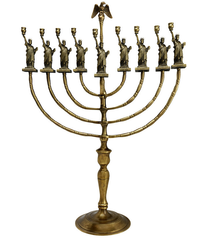 In 1986, for the statue’s centennial, Anson designed a Hanukkah menorah with nine Lady Liberty–shaped branches, and donated it to the Statue of Liberty National Museum. On each of Hanukkah’s eight nights, Jews light another candle on the menorah to commemorate the miracle that took place in Jerusalem, when the Jewish Maccabee warriors rededicated the Temple after overthrowing the Seleucid occupation. They had estimated that they only had enough oil to light the seven-branch menorah for one night, but the fire burned instead for eight. (The ninth branch, the shammash, is used to light the others.) Anson drew a connection between this story and his restorative journey to the United States, after decades of exile and persecution.