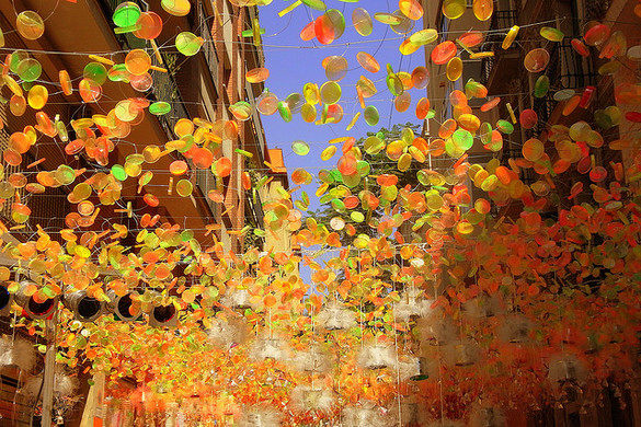 While there is an element of partying and revelry to the Festa Major de Gràcia, residents of the usually-quiet neighborhood also fiercely compete for the best decorated street. Often using recycled materials, each block chooses a theme and works to cover every inch of the narrow street. Decorations are stretched between buildings to turn streets into cave-like passages exploding with color and papier-mâché sculptures, and balconies are outfitted with everything from streamers to basketball hoops and giant scissors.