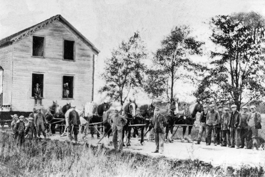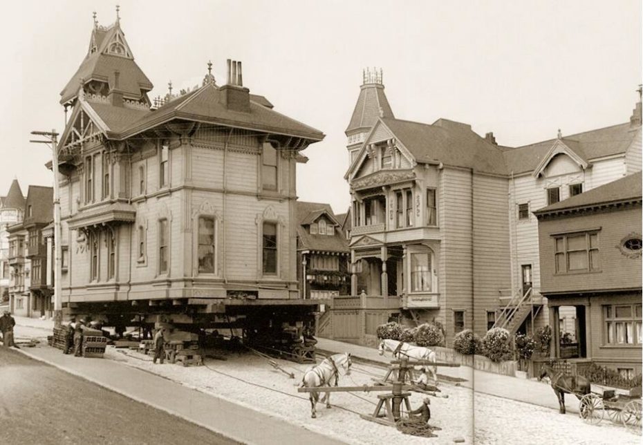 T hey say “it takes a village,” but if it was 1920-something, it took a horse– maybe a couple. As absurd as it seems today, if necessary, entire towns were known to relocate all their buildings via horse-and-buggy to proverbially greener pastures. With the rapid railway and urban development boom at the turn-of-the-century, lots of folks found themselves looking to relocate their log cabins, Victorian mansions, and other abodes, and it looks like all they needed were some solid stallions.
