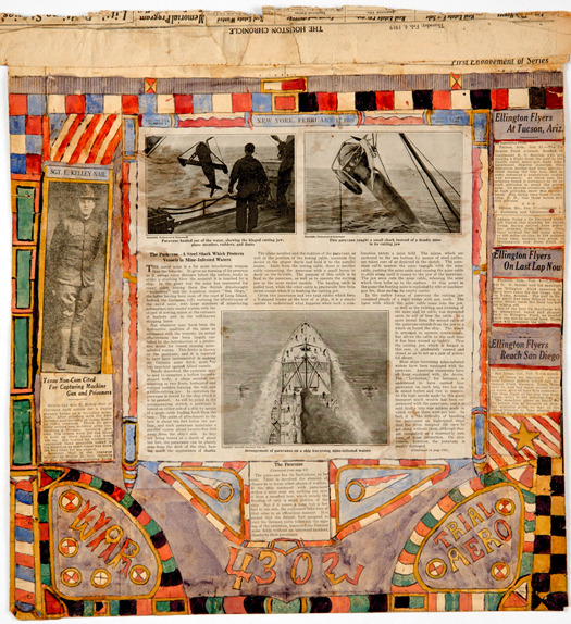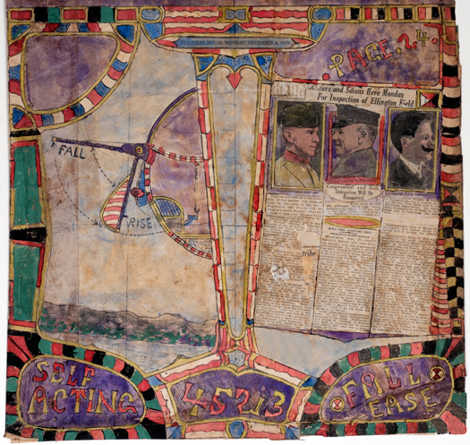 Inside the scrapbooks she discovered a remarkable collection of strange watercolours and collage pieces. More than 2,500 intricate drawings of flying machines alongside cryptic newspaper clippings filled the pages, crudely sewn together with shoelaces and thread.