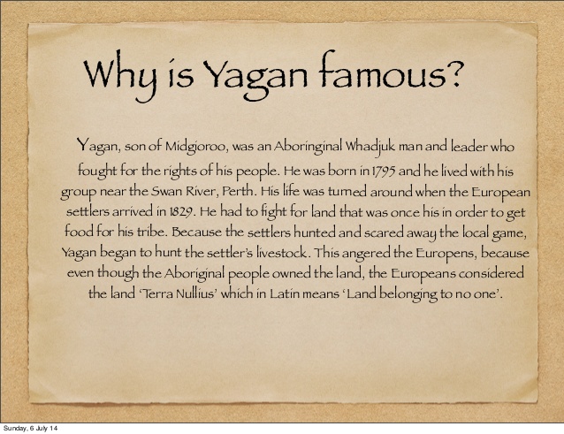 Yagan was of the Nyungar people from south-west Western Australia, where Perth, Fremantle and Albany are now situated.