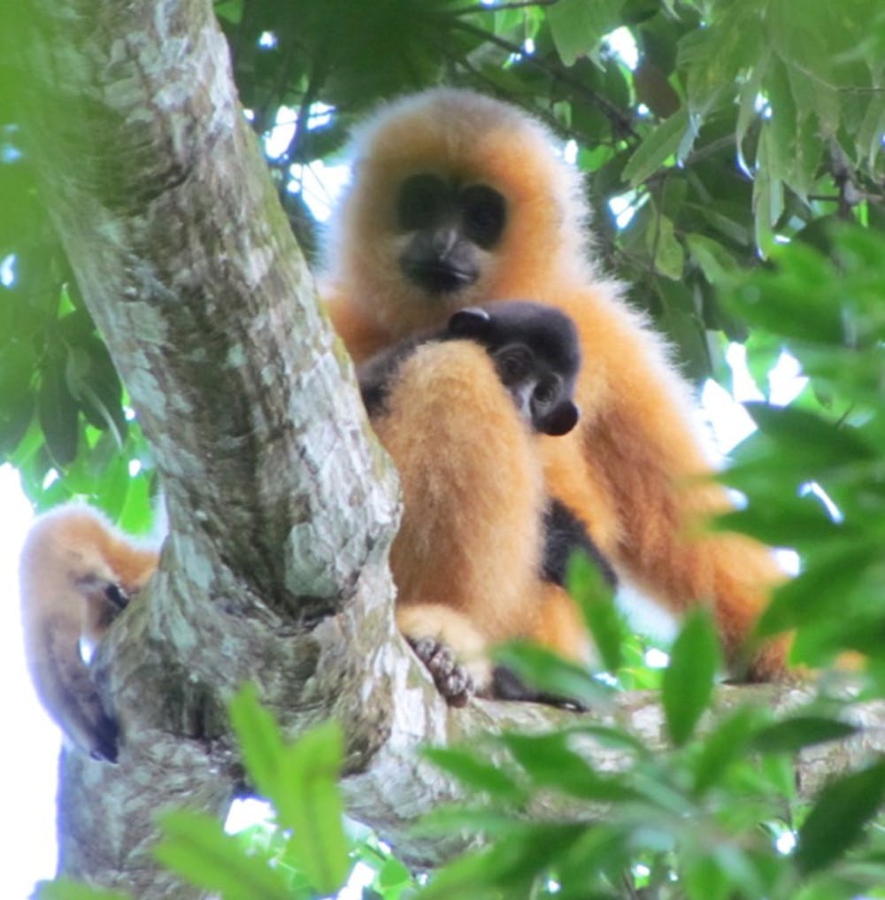 Gibbons are one of only a few species of primates that mate for life.The female gestation period lasts about 7 months and she will usually give birth to one offspring at a time.Young gibbons will stay with their parents in a family unit until they are old enough to venture off on their own and start their own family.Mated pairs, and even whole families, will sing long, complex songs together. Some species have even adapted large throat pouches to amplify their calls.They are most often heard in the early morning and may go on for half an hour or more. This morning ritual is usually initiated by the female, who is the head of the family group. Males and females have different calls.These iconic tree dwellers are among the most threatened primates on Earth. Their habitat is disappearing at a rapid rate, and they are often captured and sold as pets or killed for use in traditional medicines. All but one species of gibbon is listed as endangered or critically endangered.