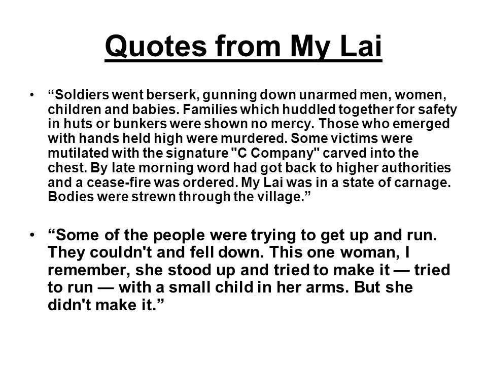 The atrocity itself was a deeply inhumane act. American soldiers stabbed, clubbed, and carved “C [for Charlie] Company” into the chests of their victims; and herded them into ditches and blew them to bits with grenades. One soldier recalled cutting victims’ throats and chopping off their hands. “A lot of people were doing it and I just followed,” he said. “I lost all sense of direction.”