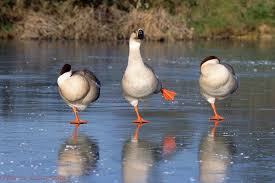 The term geese is normally used to refer to these birds in general, but more particularly a female. The term gander is generally used to refer to a male. The baby geese are referred to as goslings and a group of geese on the ground is called a gaggle with geese flying in formation being called a wedge or a skein.