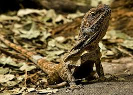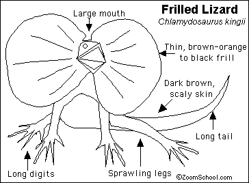The frilled lizardis fairly large speciesof lizardthat can grow to nearly a meter in length. The long tail and sharp claws of the frilled lizardhelp the frilled lizardwhen it is climbing around in the trees.