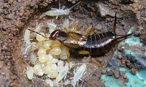 Female earwigs lay up to 80 small eggs which hatch within a couple of weeks. Female earwigs are known to be extremely protective of their young, often watching over them until they have reached their second moult(earwigs moult5 times over the course of their lifetime).