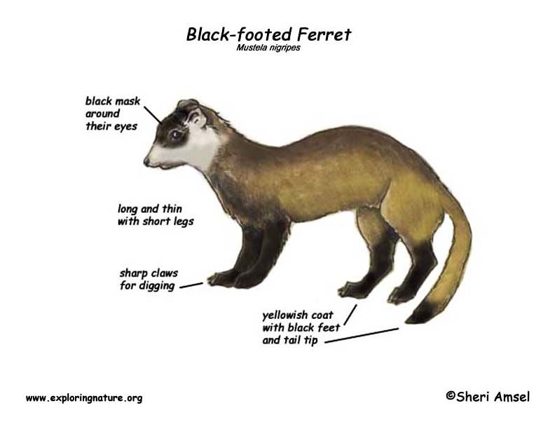 Facts About the Black-Footed FerretThe endangered black-footed ferret is a member of the weasil family. It is the only ferret native to North America.It is roughly the size of a mink, and differs from the European polecat by the greater contrast between its dark limbs and pale body and the shorter length of its black tail-tip.These solitary animals live alone, and in May and June females give birth to litters of one to six kits that they raise alone.Kits are born blind and helpless and stay below ground until they are about 2 months old. At this age, the female begins to take her young on hunting forays and separates the kits into different burrows.Black-footed ferrets are nocturnal and primarily hunt for sleeping prairie dogs in their burrows. They are most active above ground from dusk to midnight and 4 a.m. to mid-morning. Above ground activity is greatest during late summer and early autumn when juveniles become independent.Climate generally does not limit black-footed ferret activity, but it may remain inactive inside burrows for up to 6 days at a time during winter.Up to 91% of the ferret’s diet is composed of prairie dogs which are essential to their survival, though they will sometimes eat squirrels, mice and other rodents.A ferret may eat more than 100 prairie dogs in one year.Black-footed ferrets once numbered in the tens of thousands, but widespread destruction of their habitat and exotic diseases in the 1900s brought them to the brink of extinction. Only 18 remained in 1986.The animals were once found on black-tailed prairie dog colonies across the Great Plains from southern Canada to northern Mexico, and on white-tailed and Gunnison’s prairie dog colonies across the intermountain west. By 1986, they were completely gone from the wild.Today, they have been reintroduced to 15 locations within their former range in Wyoming, South Dakota, Montana, Arizona, Colorado, Utah, Kansas and Chihuahua, Mexico.Ferret reintroduction efforts have been mixed. Populations need viable prairie dog towns to survive, but they also face threats from predators such as golden eagles, owls, and coyotes. Reintroduced animals lack survival skills so their mortality rate is high. Quick FactsType: MammalDiet: CarnivoreLifespan: 3-4 yearsSize: Head and body 30-50cm, tail 11-13cmHabitat: Short grass and mixed grass prairie.Range: Wyoming, South Dakota, Montana, Arizona, Colorado, Utah, Kansas and Chihuahua, Mexico.Scientific name: Mustela nigripes