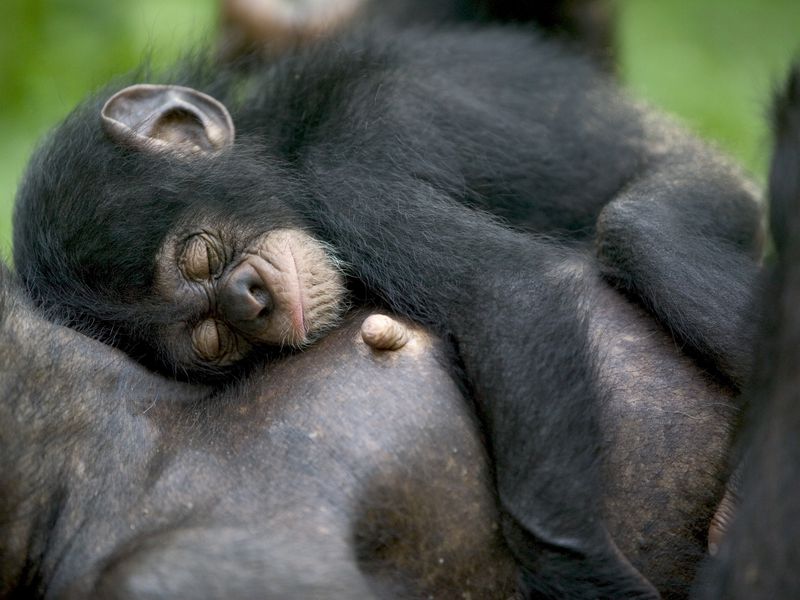 Chimpanzee infants are completely dependent on their mothers until about five years of age. When males are between the ages of 8-12 years, or adolescence, they will increase their independence and spend more time in the company of adult males. Females tend to remain close to their mothers during adolescence, becoming mature at age 11 but only beginning to breed at age 13-14. On average females will have about three offspring during their lifetime.Chimpanzees travel mostly on the ground but will mostly feed in trees during the day and make a new nest every night in the forest canopy to sleep.Their diet varies seasonally consisting mainly of fruit (~50-75%), but also leaves (~12-45%), flowers (~1-18%), seeds (~1-11%) and animal prey (~1-5%) such as grubs, termites, ants, wasps, birds and mammals including bush-pigs, duikers, rodents and even other primates. In the Ivory Coast chimpanzees will hunt together cooperatively to catch red colobus monkeys, the meat is much prized and its subsequent sharing strengthens male alliances and familial bonds.Chimpanzees have opposable thumbs and toes that allow for grasping, climbing, and object manipulation. Chimpanzees are very dexterous and are able to manipulate objects in their environment in order to fashion and use tools. These tools are usually used to obtain food sources. Sticks are used for termite fishing and ant dipping, leaf sponges to soak up water and, in West Africa, chimpanzees use specially chosen rocks to crack hard palm nuts, a behaviour that can take many years to perfect. Baby female chimps were recently discovered playing with sticks like human children play with dolls.· Chimpanzees have many different vocalizations from soft grunts and lip smacks to alarm barks and screams. One of the most notable vocalizations is the pant hoot used in situations of increasing social excitement. Chimpanzees are also capable of learning basic human sign language.