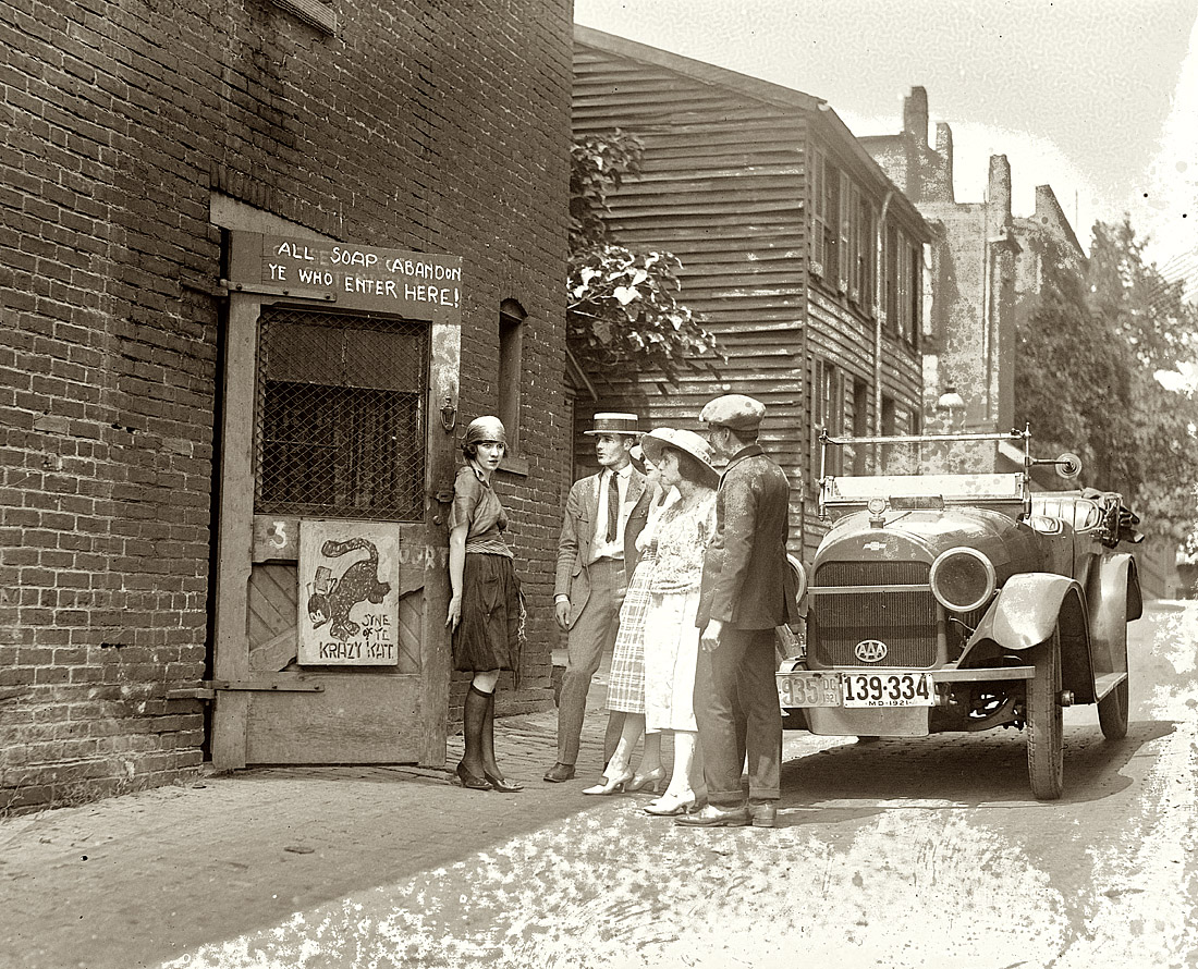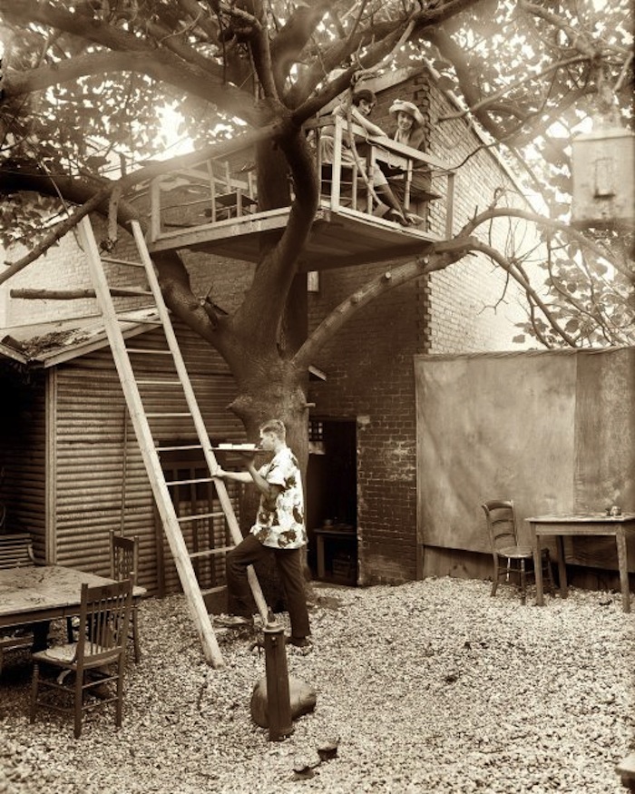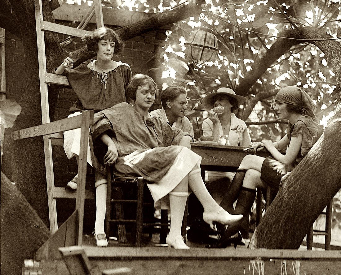 W e’ve stumbled upon the backyard of a speakeasy club called the Krazy Kat Club in Washington DC, July 15, 1921. It looks like they might have decided to move their staff meeting outside to their treehouse in the heavy heat of July– and nobody is in the mood for business.