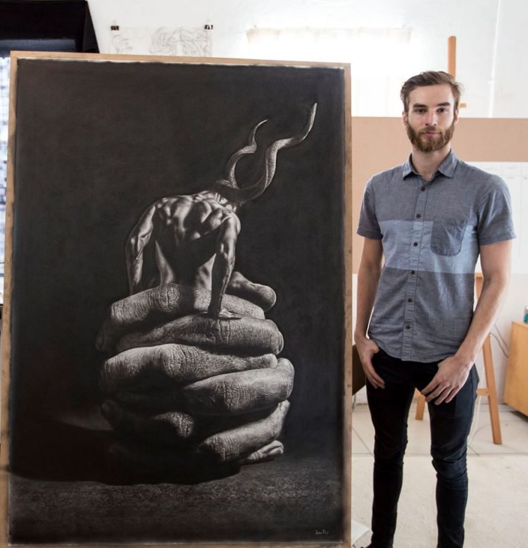 The talented artist draws inspiration from everything around him, and specializes inn hyperrealism and surrealism, sometimes combining the two into artworks that mimic his ability to push the limits of what is real and possible. I don’t even know what’s more impressive about Jono’s work, his incredible technique or the concepts he comes up with for his compositions.