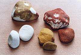 Ochre was the most important painting material used traditionally by Aboriginal people. It is mined from particular sites and is a crumbly to hard rock heavily coloured by iron oxide. The source material was traded extensively across Australia in the past, with some material traveling many hundreds or even thousands of kilometres from where it was mined to where it was used. It comes in a variety of colours from pale yellow to dark reddish-brown.