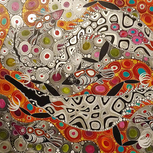 The next step is to apply the distinctive cross-hatched pattern that creates the shimmering effect in Arnhem Land art. (see article on Yolngu painting). This is done with a special, fine brush made of a short stick with straight human hair tied tightly onto it. This gives the delicacy needed to produce the fine parallel lines of the rarrk patterning. The last step is to outline the figures and crosshatched areas in white ochre, again using a brush. The painting Macassan by Charlie Matjuwi is a good example of all these steps in application.