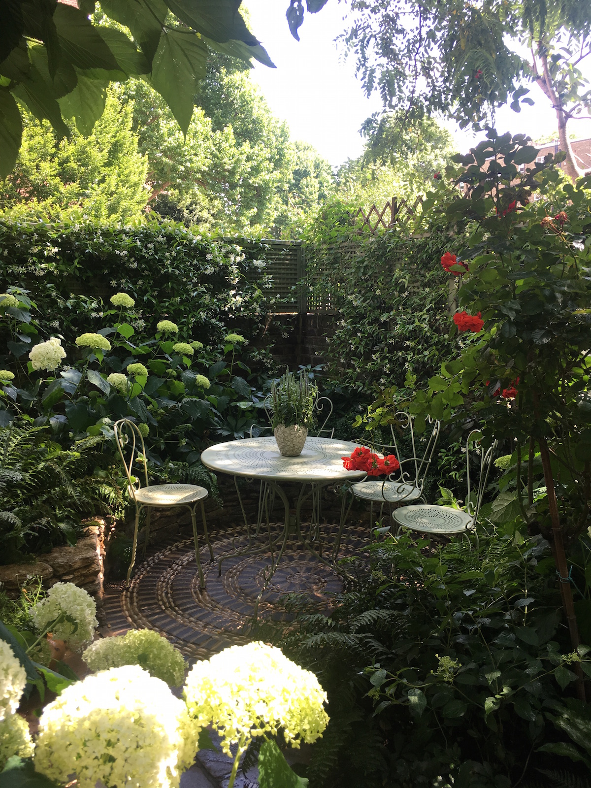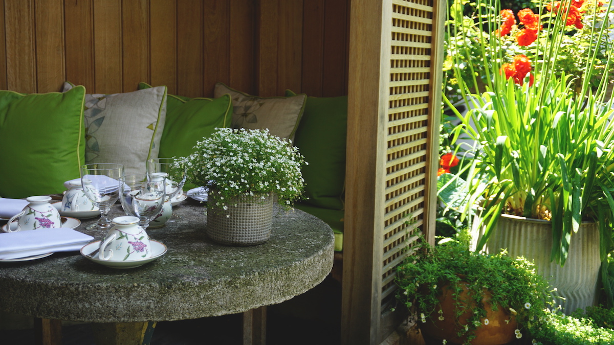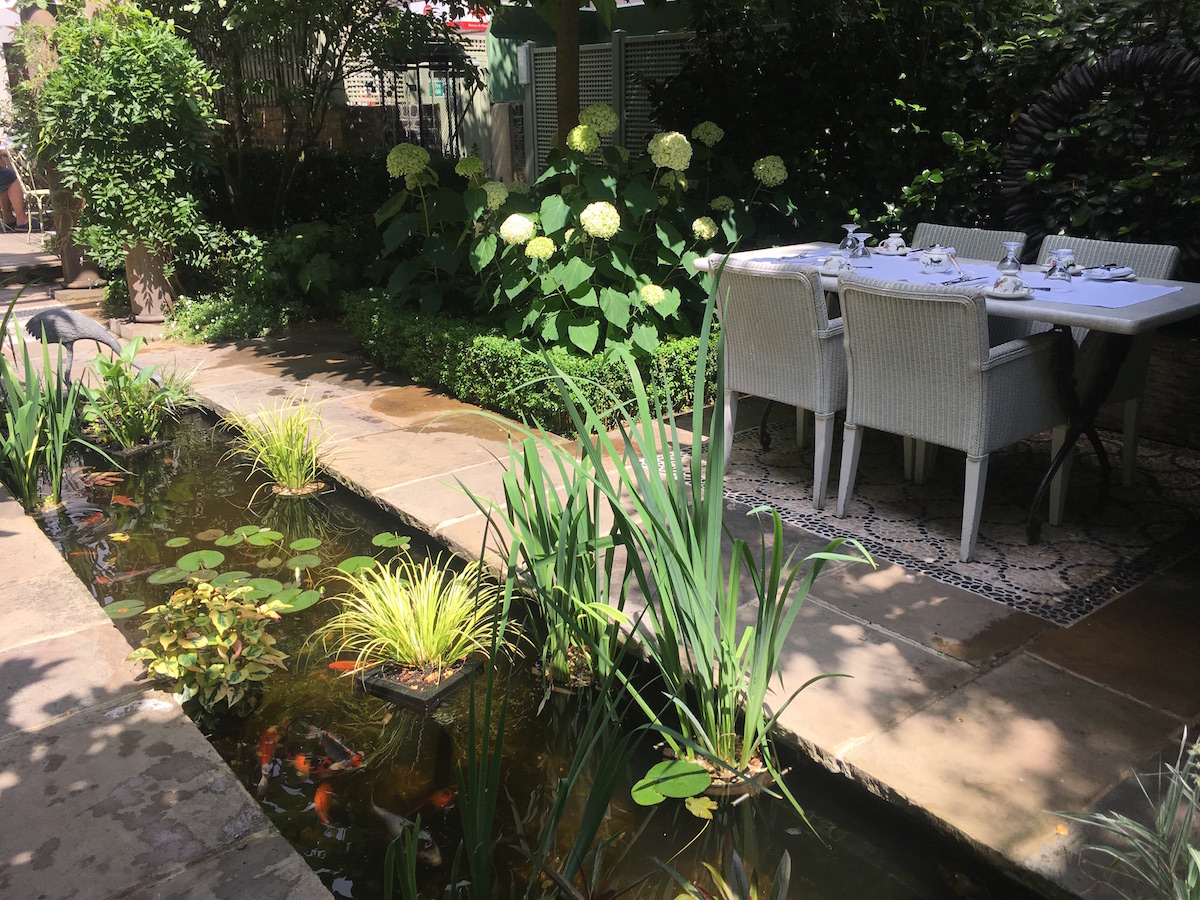 Just about the only noise disturbance here is the over-sized goldfish belly flopping in their shallow pond that runs down the centre of the garden, stopping before a wooden gazebo with cushioned seating and a table set for afternoon tea.
