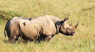 The black rhinoceros is in fact grey in colour. They often assume the colour of the local soil in which they wallow. The black rhino is also called the Hook-lipped Rhinoceros.Related species are the white rhino, the large Indian rhino, the smaller Javan rhino and the Sumatran rhino.It is a solitary animal, active mainly at night.The black rhino is considered the most aggressive species of its family and, despite its massive bulk, they can charge at great speeds of 50km per hour at an unwary observer. They are fully capable of killing a human being and can even cause serious damage to a car. It rarely presses home such attacks, preferring instead to browse the low trees of its wooded habitat, or simply to doze in the cool shade.Rhinos have specialised upper lips, which is prehensile (capable of grasping) and are adapted for feeding from shrubs which it strips the leaves and shoots from.Due to the structure of their mouths, the rhino cannot easily graze compared to other animals, but they tear up and eat clumps of long grasses instead.The oxpecker bird is a welcome passenger to the rhino as it picks parasitic ticks out of the rhino’s skin. The birds provide another valuable warning service to the rhino as it is known to screech loudly when humans approach.A rhino was once seen wallowing with six turtles picking out ticks as they climbed over her body.Since it needs to drink once a day, the rhino stays within 5km of water. In very dry conditions, it can dig for water using its forefeet.As it cannot sweat, the rhino, similar to an elephant, will roll in mud or dust to keep it cool and give it a protective coating of mud against biting insects.They are territorial animals, using scent as a signal, spraying urine along paths and using communal dung heaps to mark their territory. It scrapes with its hind feet after defecating to collect and carry the sent away with it.They mate at any time of the year. The male rhino has a breeding ritual to attract a female. He will brush his horn over the ground, charge at bushes, rushes back and forth and frequently sprays urine. The females are known to reject the males aggressively at first until she succumbs.Gestation is long at 15 months and they produce 1 calf. Young rhinos can walk 10 minutes after they are born. However, the mother will keep it hidden for a couple of weeks in fear that it may get trampled upon.Black rhinos stop growing when about seven years old. The female can breed before this, but in the wild she will have just one calf every two to five years.A rhino has very few predators, although a lion may try to take a calf. A spotted hyena is a more serious threat, but man is the deadliest of all.Sadly they have been threatened almost to extinction due to hunting. Hunters prize the rhino’s magnificent horn, which is valued for ornamental and medicinal use.Some rhinos have been de-horned to make them worthless to poachers.Recent conservation has been successful but there is a lot more work needed to bring back the Rhinos population to what it once was and to avoid it being lost forever.