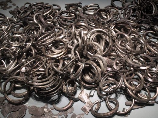 The hoard, believed to have been buried beneath a ninth-century outhouse, consisted of coins, ingots, and jewelry items such as rings, bangles, and necklaces. Of the 14,295 coins discovered here, as many as 14,200 of them were centuries-old Islamic dirhams. The remaining 95 were an assortment of Nordic, Byzantine, and Persian coins. A few were contemporary counterfeits.