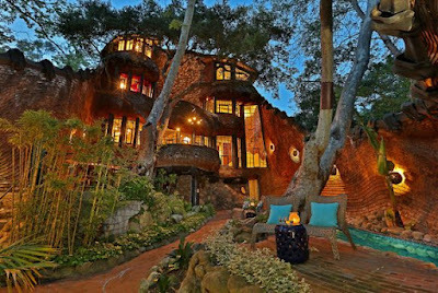 The Whale House has no flat walls and virtually no straight lines. Three bedrooms (which can sleep nine) and 3.5 bathrooms let people live comfortably within the belly of the sea creature. A 75-foot lap pool leads to the tail of the whale (read: a detached guest house). Further playing upon the home’s name, Carmichael littered the entrance with rocks to emulate a whale’s mouth full of teeth, and used a high-sitting stained glass window to serve as the mammal’s eye.