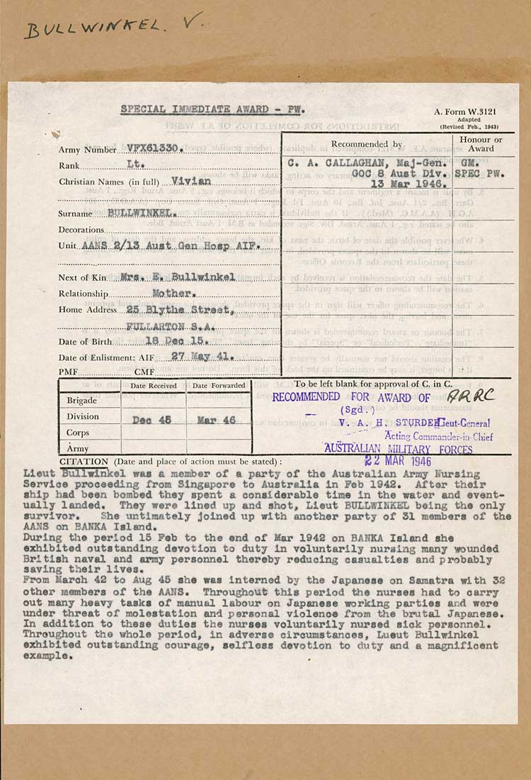 Vivian Statham (née Bullwinkel), AO, MBE, ARRC, ED (1915–2000) G'day folks, Lieutenant-Colonel Vivian Bullwinkel, Mrs. Statham, AO, MBE, ARRC, ED, FNM was an Australian Army nurse during the Second World War. Vivian Bullwinkel was born in Kapunda, South Australia, and trained as a nurse in Broken Hill, New South Wales. In 1941, aged 25, she enlisted in the Australian Army Nursing Service. She was posted to the 13th Australian General Hospital and sailed for Malaya. Faced with the Japanese invasion of the Malay Peninsula, the hospital shifted to Singapore Island in January 1942.