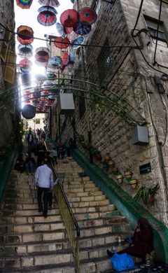 For many years there has been a tradition of decorating the city with bright graffiti (some of it even commissioned), and this includes many very colorfully painted staircases. A more recent phenomenon, however, is the umbrella-covered staircases: also colorful, shaded, and almost oasis-like amid the heat and bustle of old Amman.