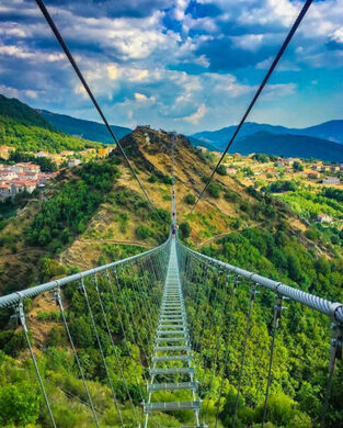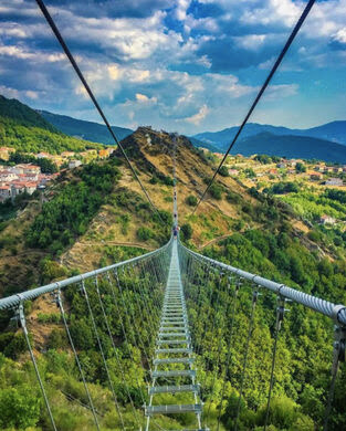 Crossing this suspension bridge feels like walking through the sky, a fitting tribute to the head of the Apollo program.A system of Tibetan bridges—simple suspension bridges—drapes between two peaks in the Apennines of Basilicata. The main bridge, named Ponte alla Luna, or Bridge to the Moon, is nearly 1,000 feet long and dangles almost 400 feet above the creek below.