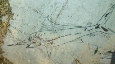 The fossil is said to be a member of the Istiophoridae fish family, most likely a Blue Marlin. It’s believed to be about 30 million years old. The nearly eight-foot-long, three-foot-high fish was first noticed in 1982.