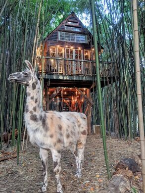 This wondrous hideaway is suspended in a bamboo forest above a sanctuary for rescued llamas and alpacas.Nestled in Atlanta, Georgia, inside a dense and enchanting bamboo forest, rests a treehouse hideaway that was once only the dream of its creator. Inspired by the treehouses of her youth, Kara O’Brien was immediately struck with a vision to create something magical in this space.