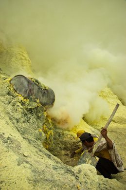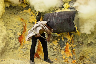 Working on the side of the active volcano in temperatures surpassing 100 degrees Fahrenheit, workers use metal poles to hack out chunks of elemental sulfur. Using ceramic pipes, they channel the gases which drain out as liquid red sulfur which then hardens into the yellow chunks the miners carry out. To do all this, the workers must stand near a live sulfur vent pouring out masses of the noxious, choking gas (the air carries H2SO4 and CaSO4, which are both toxic). The workers then load baskets with 150-200 pounds (68-91 kilos) of sulfur chunks and haul them up 200 meters to the crater rim, and then down three kilometers of traile and 1500 meters of elevation to the weighing station where the sulfur is sold to be used in vulcanizing rubber and bleaching sugar. The reward: around US$13 a day.