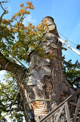 Today the common oak is showing signs of age and stress. Now held up by poles, part of the 33-foot trunk has died and the majority of the tree has been covered over with wooden shingles where the bark has fallen away. Although Chene Chappelle’s host tree has begun to wane, its congregation still gathers twice a year for Mass and the tree is still the destination of annual pilgrimage on August 15, the Feast of the Assumption of the Virgin.