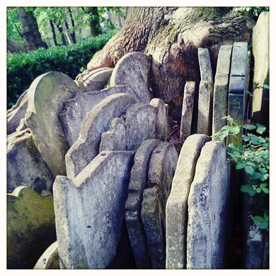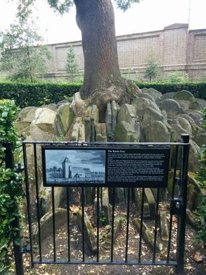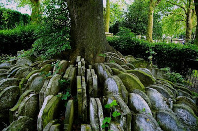 This churchyard arbor is surrounded by hundreds of gravestones placed there by author Thomas Hardy.Inside an ancient London churchyard, an ash tree is encircled with hundreds of overlapping gravestones placed there by classic novelist Thomas Hardy.
