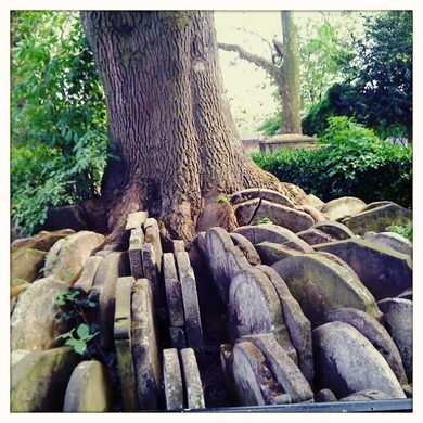 After the essential duty was completed, there remained hundreds of headstones, along with the question of what to do with them. Hardy’s solution was to place them in a circular pattern around an ash tree in the churchyard in a spot that would not be disturbed by the railway. One can only speculate as to how he arrived at this decision, but over the years the tree has absorbed many of the headstones, life and death melding into one image of grotesque and gothic beauty, preserved for centuries.
