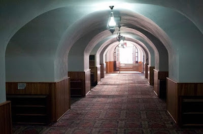 The easy-to-miss mosque is accessed from two entrances at street level, which lead to a short tunnel down into the earth. The ceiling is very low and the space is dark, illuminated with just a few lamps and some strident green fluorescents that illuminate the ancient tombs of two Arab martyrs.