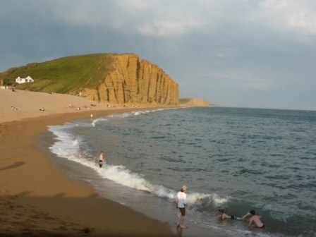 This beach, at West Bay, was absolutely the most painful and difficult beach I have ever attempted to walk on. All pebbles, they were exactly too small to hold your weight but too big to count as sand. Yet the hardy Brits were sunbathing and splashing merrily. We climbed to the top of that cliff in the distance and when we got back down, Sara and I were like, NO WAY are we walking across the beach into town. We set off through the parking lot.
