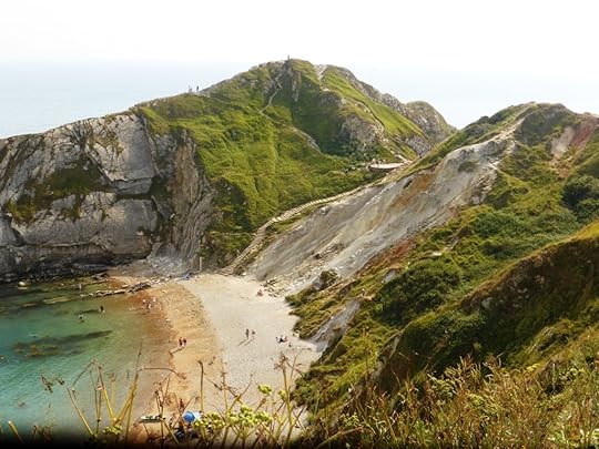 We walked from Lulworth Cove to Durdle Door and back along the cliff path, which was very beautiful. It was a stunning and warm day but fortunately some thoughtful and enterprising person had hauled an ice cream van down the cliff path via tractor, where they were doing a roaring business in ice cream, Dorset tea, dog snacks and selfie sticks.