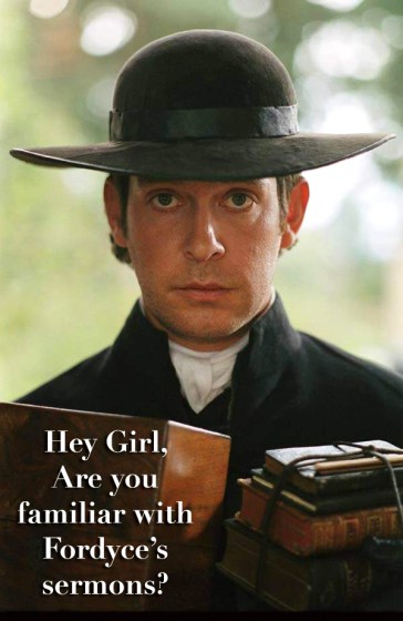 “By tea-time, however, the dose had been enough, and Mr. Bennet was glad to take his guest into the drawing-room again, and, when tea was over, glad to invite him to read aloud to the ladies. Mr. Collins readily assented, and a book was produced; but, on beholding it (for everything announced it to be from a circulating library), he started back, and begging pardon, protested that he never read novels. Kitty stared at him, and Lydia exclaimed. Other books were produced, and after some deliberation he chose Fordyce’s Sermons.”