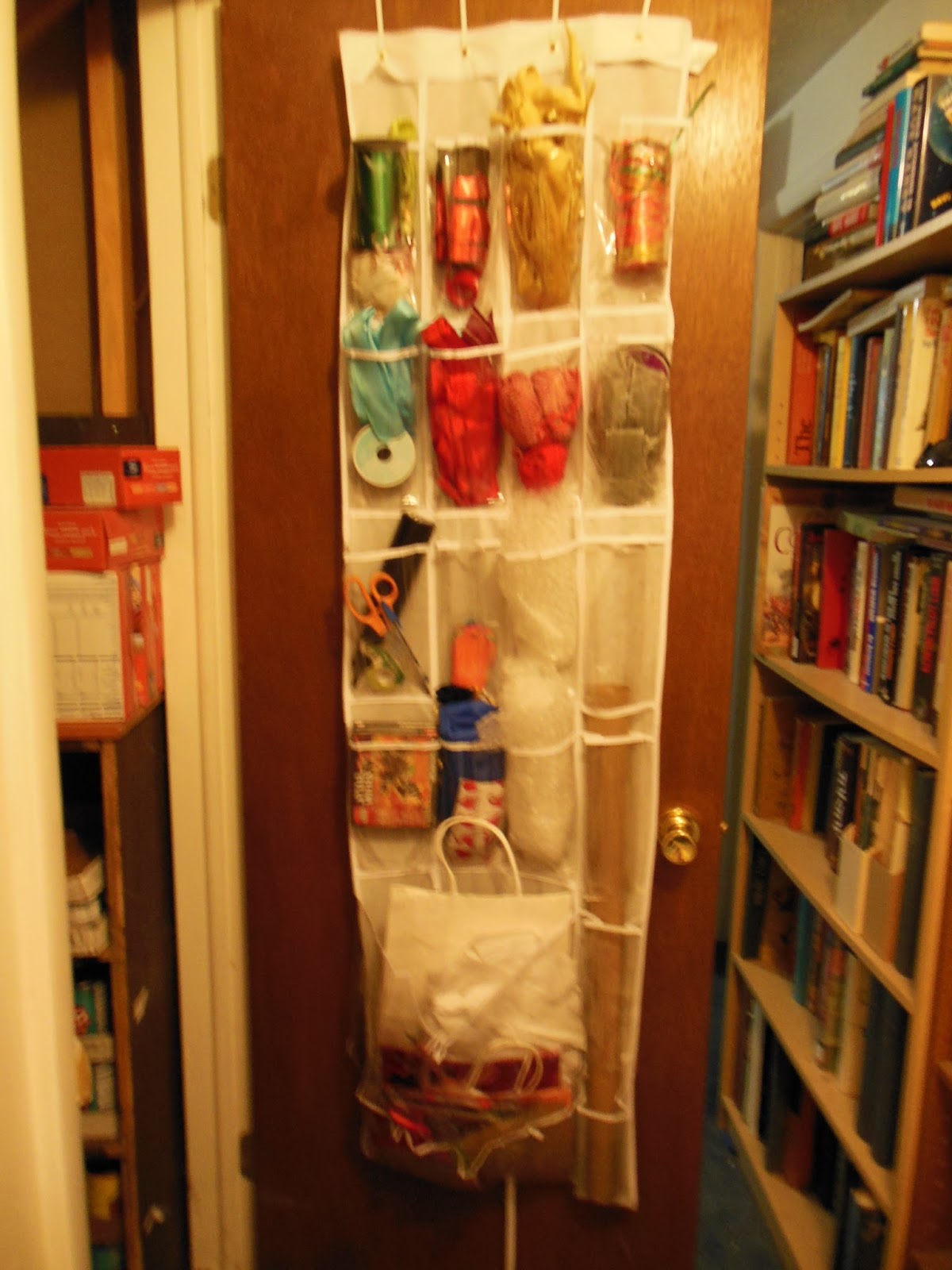 This is my new gift wrap station that I keep on the door of our Harry Potter room downstairs. I used a cheap over-the-door shoe organizer from WalMart
