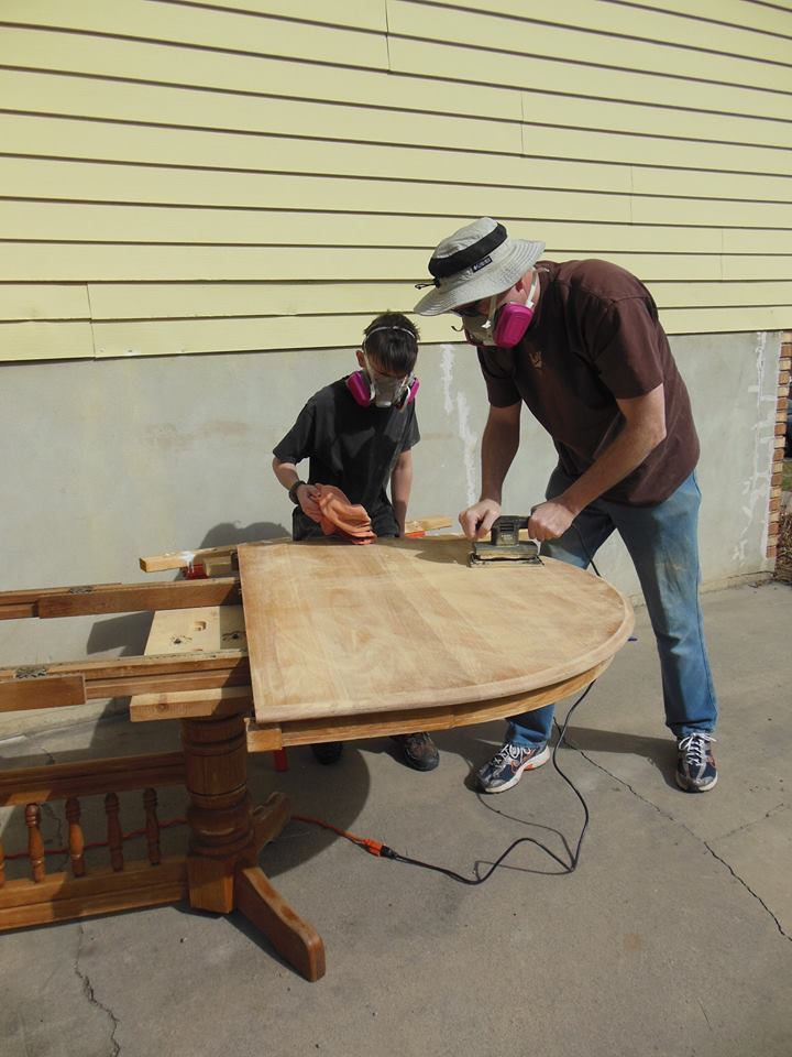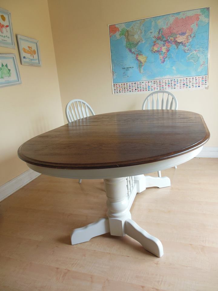 It had a golden oak finish, and the top of the table was pretty thrashed. We bought it used to begin with, so it came with plenty of wear and tear, but we had added even more. As you can see, my husband and son helped me sand down the top. (They did most of that, actually.) I got stuck with the washing, staining, and painting, which was plenty. Here's how it turned out: