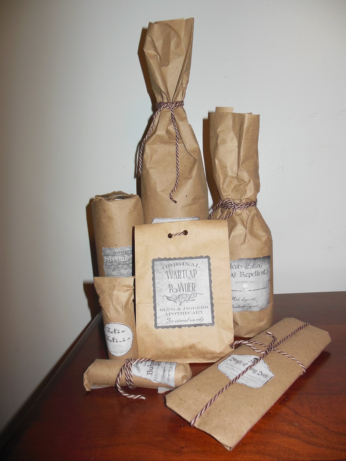 I wrapped the gifts like potions, using labels I found on this site. My daughter has a good job, so she buys herself most of what she needs and wants. I just bought her some fun foods and drinks that I thought she would like.