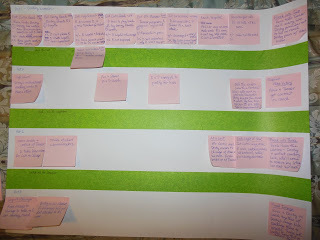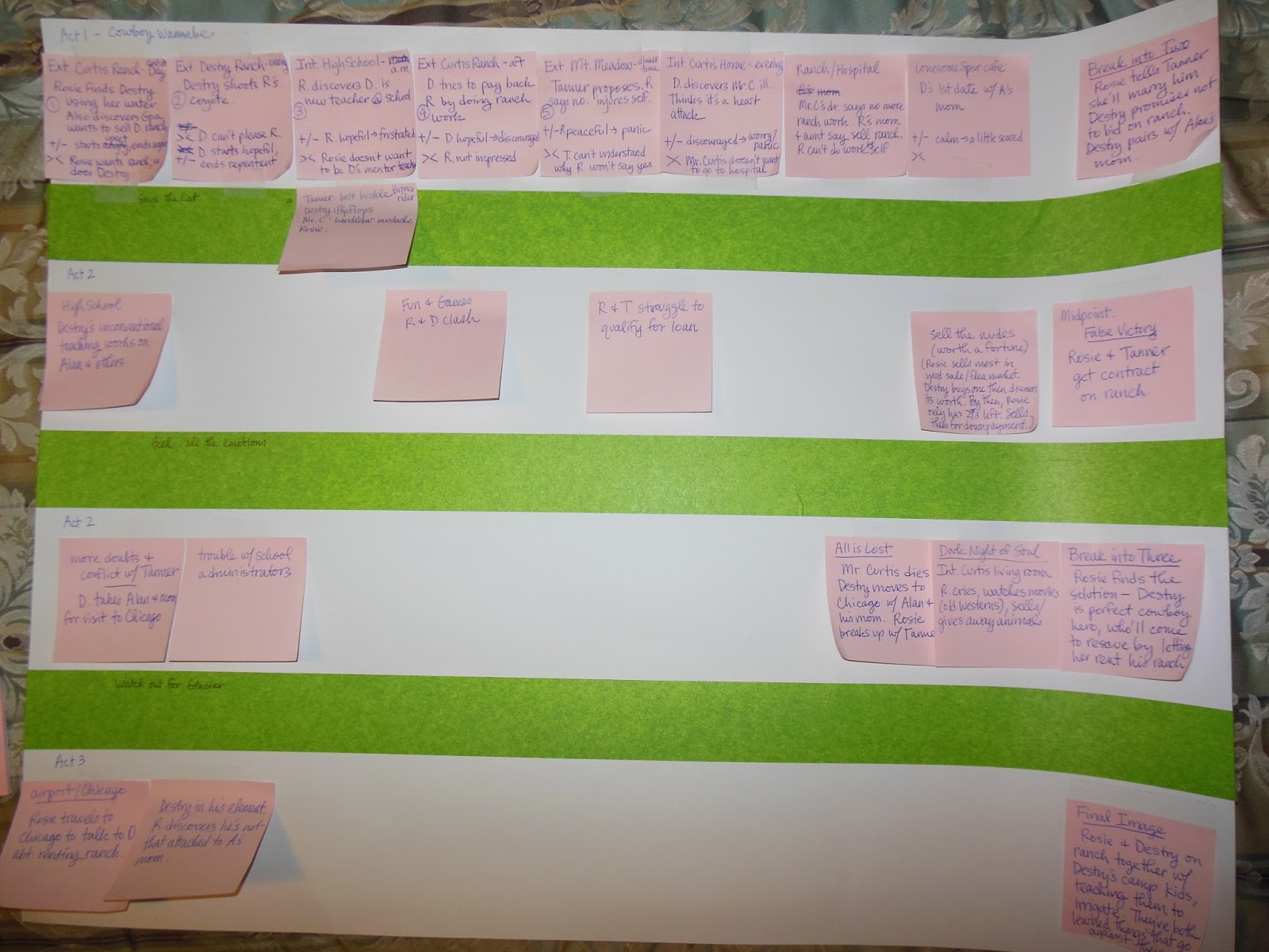 It was a poster divided into three acts, represented by the four rows. (Don't ask me how it makes sense to have three acts in four rows. It just does. LOL.) I eventually filled in all four rows with post-it notes, detailing scenes. It was incredibly useful, but I didn't have a good idea of how the plot worked until I watched the youtube video above of Dan Wells teaching his seven point plot structure.
