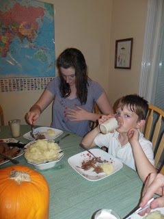 We started out with a dinner of roast beef, mashed potatoes, and butterbeer, which is a mix-up of food from Hogwarts and Hogsmeade. I found the recipes here. (Yes, I also added vegies because I'm a mom, but you will note that the kids have not yet put any on their plates in this picture.)