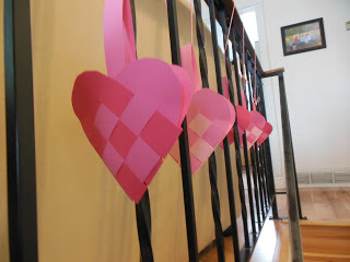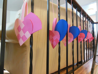 It took me about fifteen minutes to make eight of them and hang them up. I've made woven hearts like these before, but if you haven't, you can find simple instructions for making heart baskets, which are the same thing, on this website or this one.